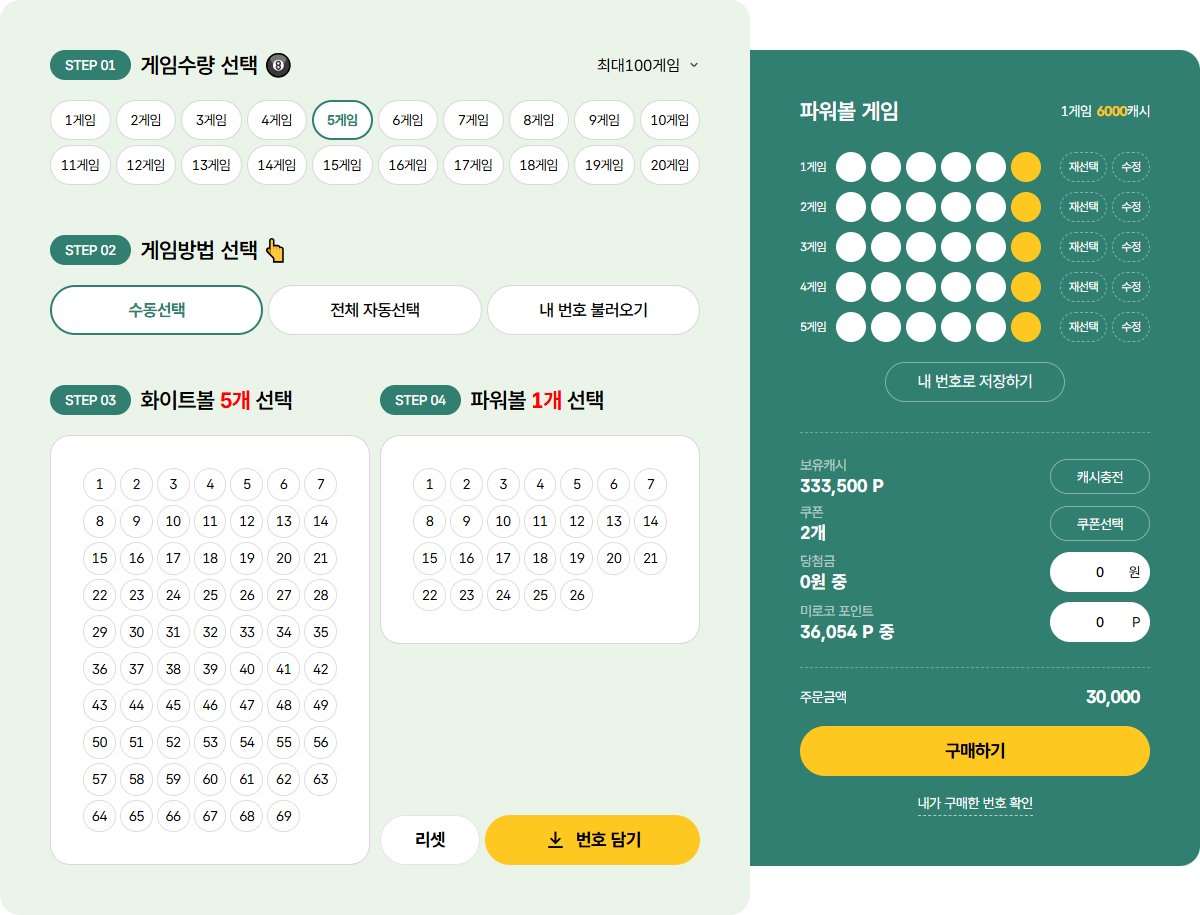 1부터 26까지의 숫자 중 파워볼 1개를 선택하여 총 6개의 번호를 선택합니다.